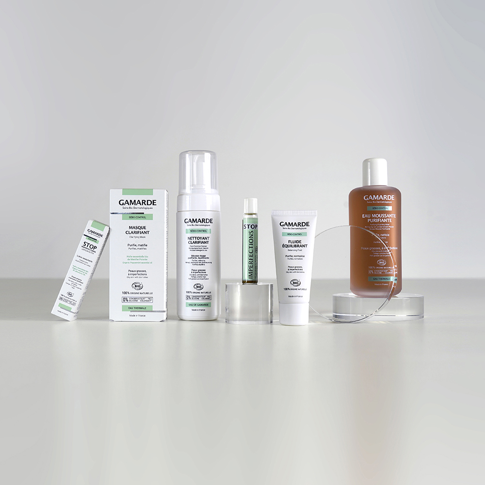 - (1) Test d’usage réalisé auprès de 20 femmes de 20 à 45 ans présentant une peau grasse, application 2 fois par jour pendant 28 jours.