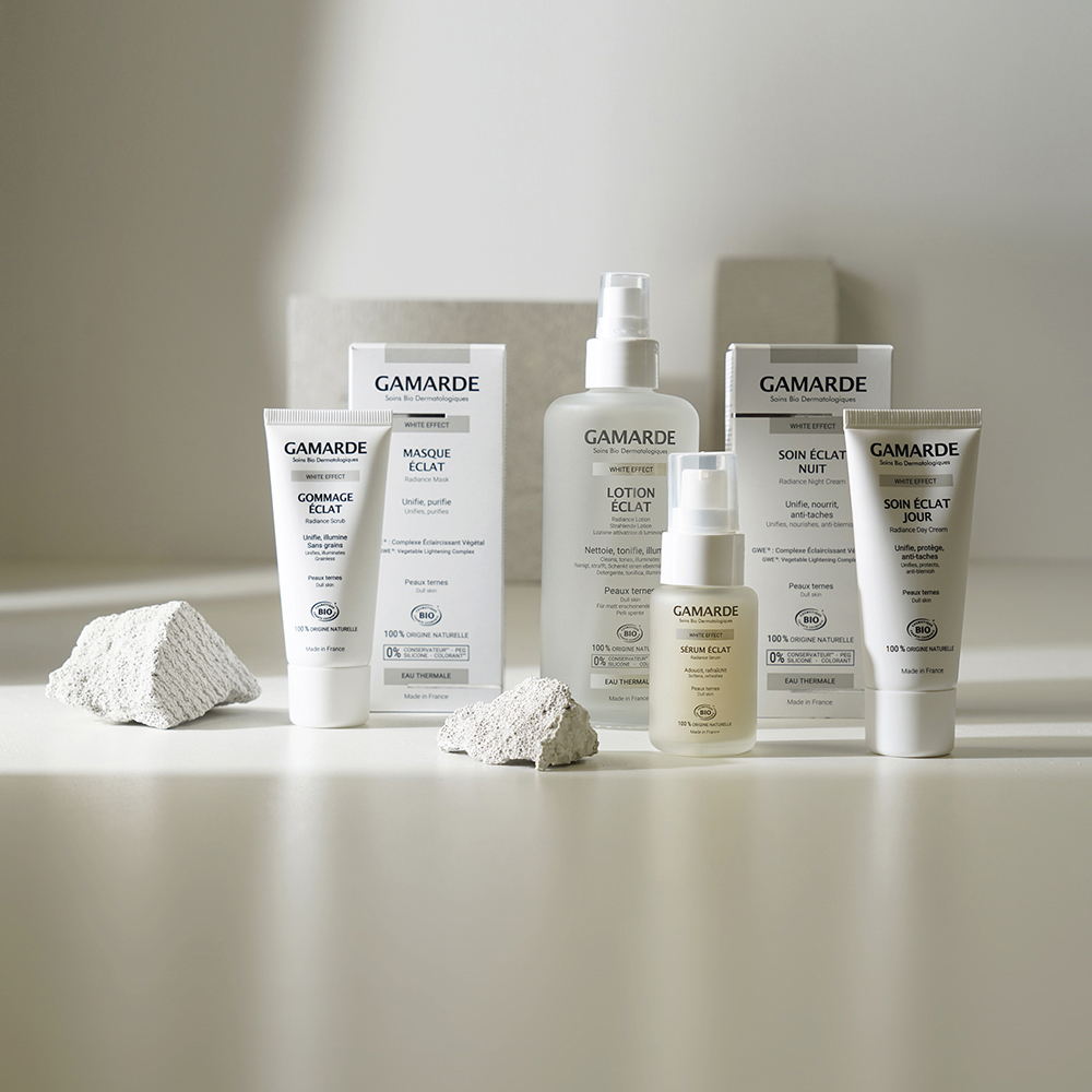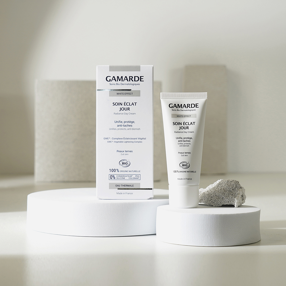 éclaircissant GWE® certifié bio qui diminue la production de mélanine responsable des taches. Le teint est unifié et son éclat ravivé. La taille et l’intensité des taches brunes sont diminuées pour 100% des personnes l’ayant testé(1). Formulation Vegan